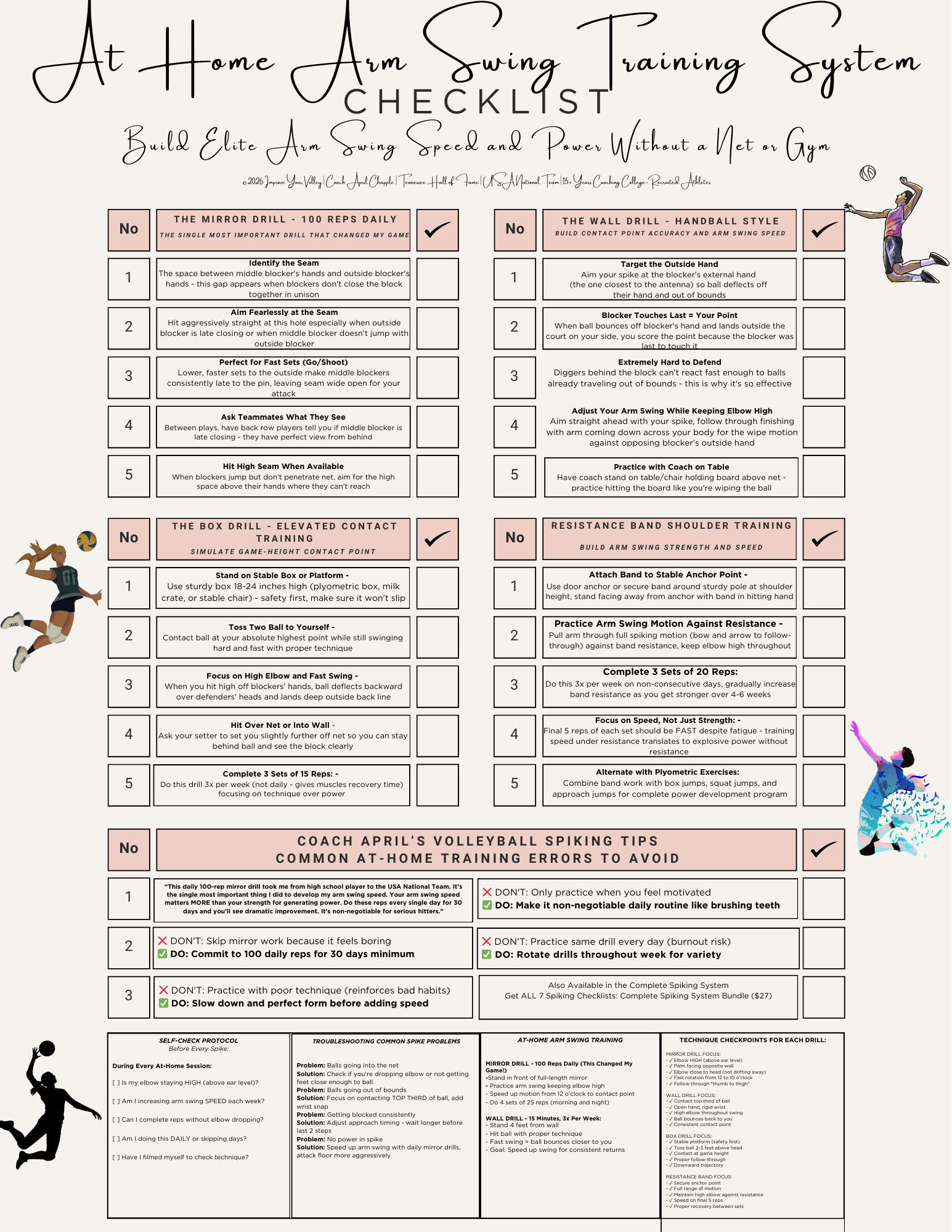 What Makes This Different: ✅ Specific daily protocols (not just "practice your arm swing") ✅ At-home drills (no net, no gym, no equipment needed) ✅ 8-week progressive training program ✅ Weekly practice goals ✅ Progress tracking for arm swing speed ✅ Arm swing speed measurement system ✅ Daily training log templates ✅ Motivation & accountability strategies
