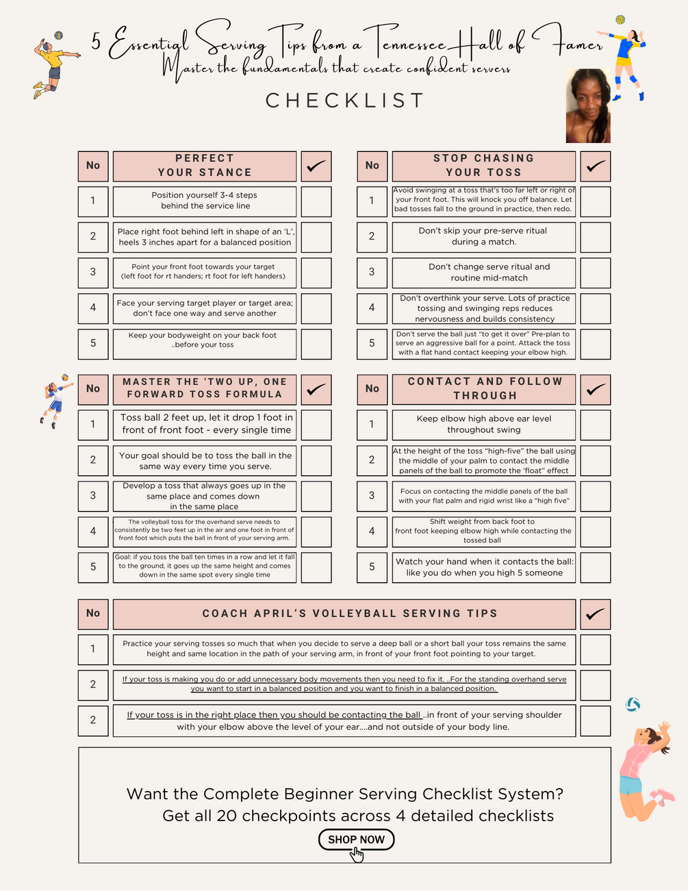 What You'll Get FREE: ✓ 23 systematic serving tips from Tennessee's #2 career aces record holder ✓ Body-part-specific breakdowns you won't find anywhere else ✓ Beginner-friendly techniques that build proper habits from day one ✓ Instant PDF download - no credit card required ✓ Same methods that developed multiple Gatorade Players of the Year