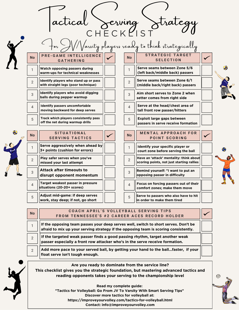 Stop serving without a game plan when you could be executing strategic attacks that exploit opponent weaknesses. This tactical strategy system reveals the intelligence gathering, target selection, and situational serving techniques that transform reactive servers into strategic point scorers. What You'll Get: • Pre-game intelligence methods - Identify technical weaknesses and poor passing habits during opponent warm-ups • Strategic target selection - Master seam serving and zone targeting that creates immediate passing problems • Situational serving tactics - Know when to serve aggressively vs. safely based on score and game situation • Mental approach strategies - Develop point-scoring mentality and force passers out of comfort zones • Coach April's tactical tips - Adjust serving strategy mid-game and target front-row hitters effectively • **1-page PDF checklist** - Convenient format you can print or keep on your device for strategic reference